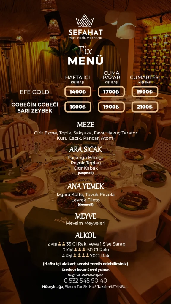 Sefahat Yeni Nesil Meyhane, İstanbul’un kalbinde; modern dokunuşlarla geleneksel meyhane kültürünü bir araya getiren özel bir mekândır.